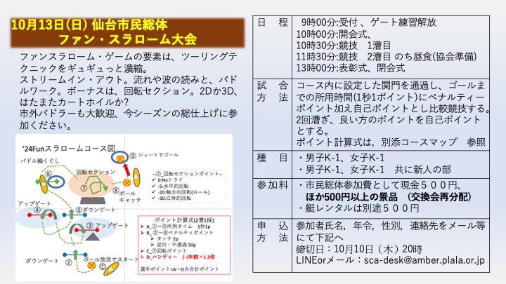 カヌー「ファン・スラローム」とは、ゲートセクションあり、水平・立体回転セクション、パドルの輪くぐしなど、本気とも冗談ともつかないおちゃらゲームです。年齢を考慮したハンディーもあり、全ての参加者に上位入賞の可能性があります。