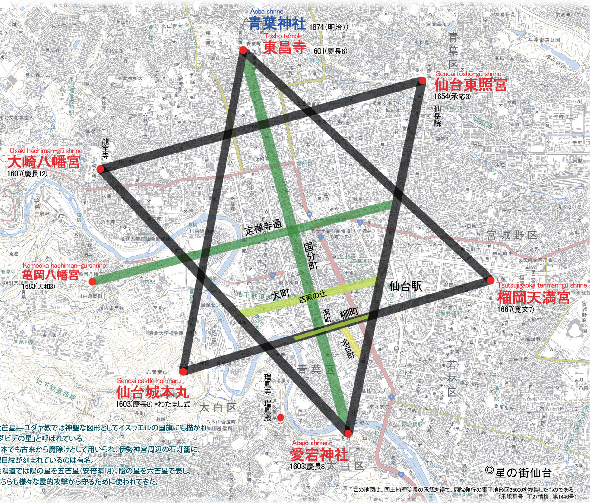 六芒星の中心は定禅寺通りと国分町通りの交差点ですが、城下の中心(高札場)は芭蕉の辻です。この場所に決めた理由を、塩竃神社→青葉山→太白山を通るレイラインから考察します。