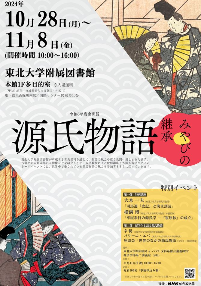 東北大学附属図書館が所蔵する古典資料を通じて、源氏物語の持つ魅力や、広く世間へ親しまれた様子、作者である紫式部の人物像などを紹介します。