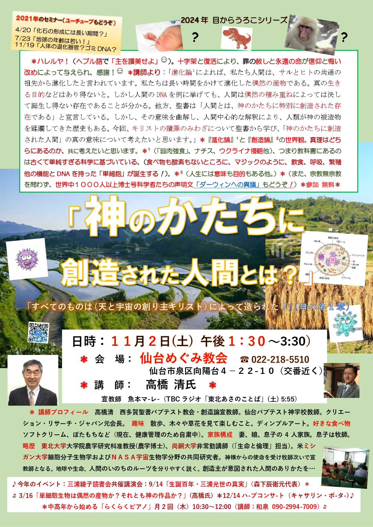 講師:高橋清氏(元東北大学大学院農学研究科准教授(農学博士)元尚絅大学非常勤講師 西多賀聖書バプテスト教会・創造論宣教師