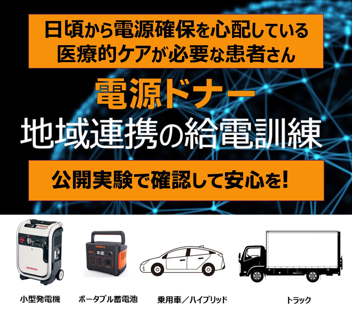 医療的ケアが必要な患者さんご家族そして支援者を対象に、いつ起こるか分からない大災害や自然災害そして長期停電に備え、電源確保のいくつかの選択肢を実際に確認する給電訓練の公開実験を仙台市太白区の「ありのまま舎」で開催します。