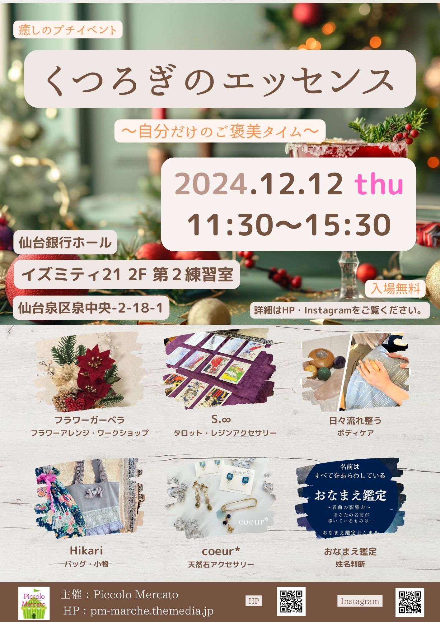 施術や占い・ハンドメイドの作品の販売など、ゆったりと過ごしていただける癒しのプチマルシェです。