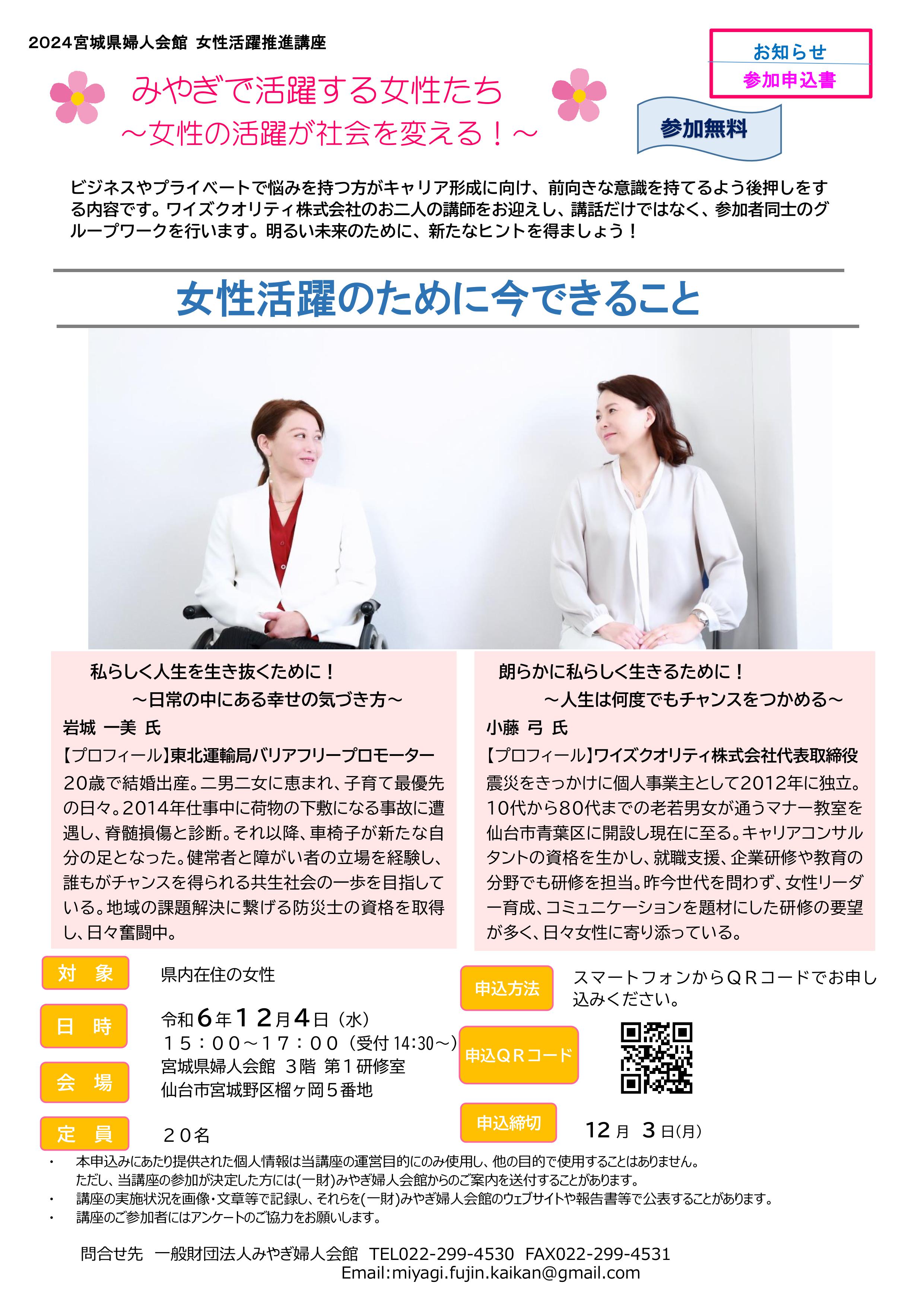 ビジネスやプライベートで悩みを持つ方がキャリア形成に向け、前向きな意識を持てるよう後押しをする内容です。ワイズクオリティ株式会社のお二人の講師をお迎えし、講話だけではなく、参加者同士のグループワークを行います。明るい未来のために、新たなヒントを得ましょう!