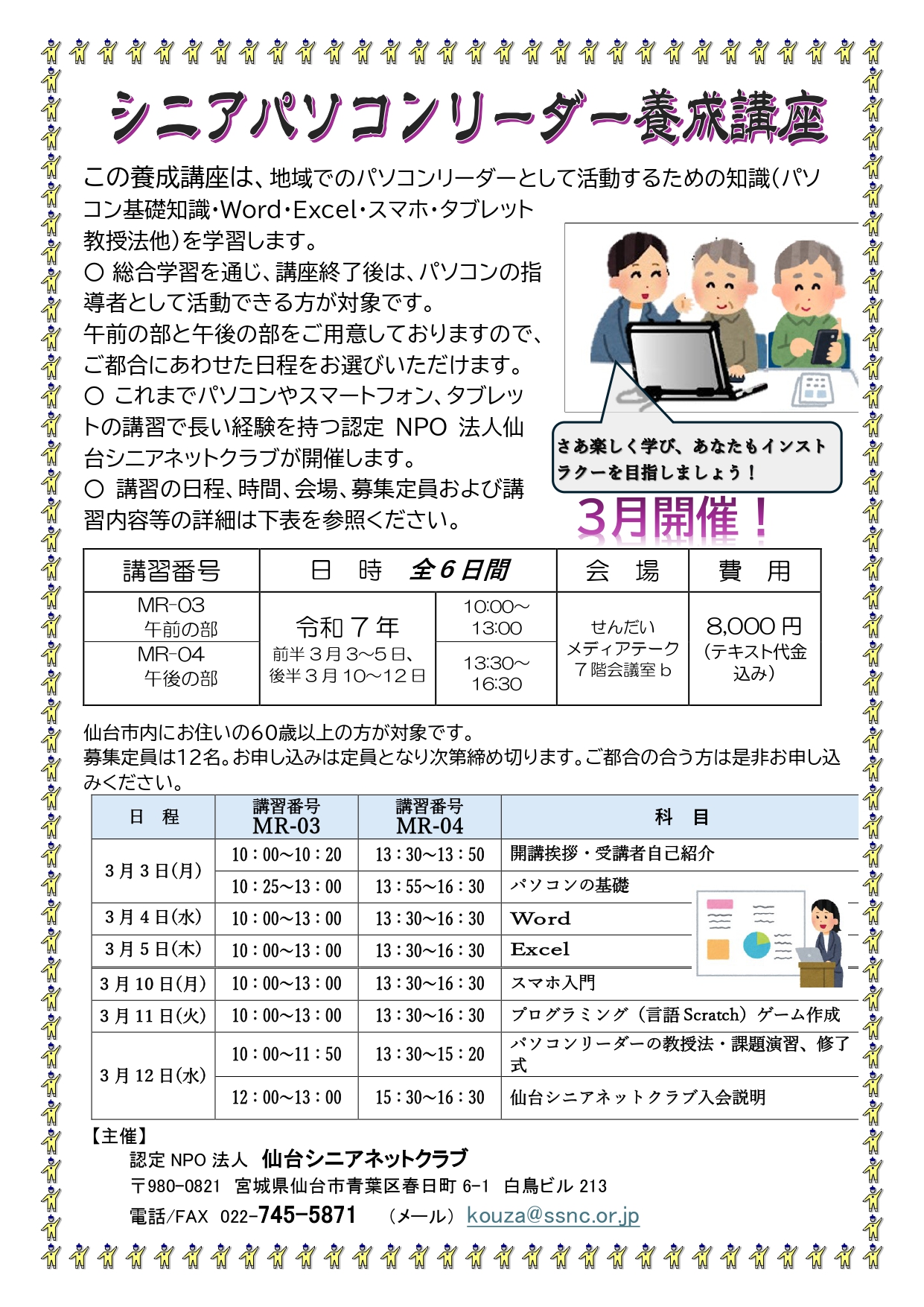 地域でのパソコンリーダーとして活動するための知識(パソコンの基礎知識・Word・Excel・スマホ・タブレット他)を学習します。又教授法も学習します。