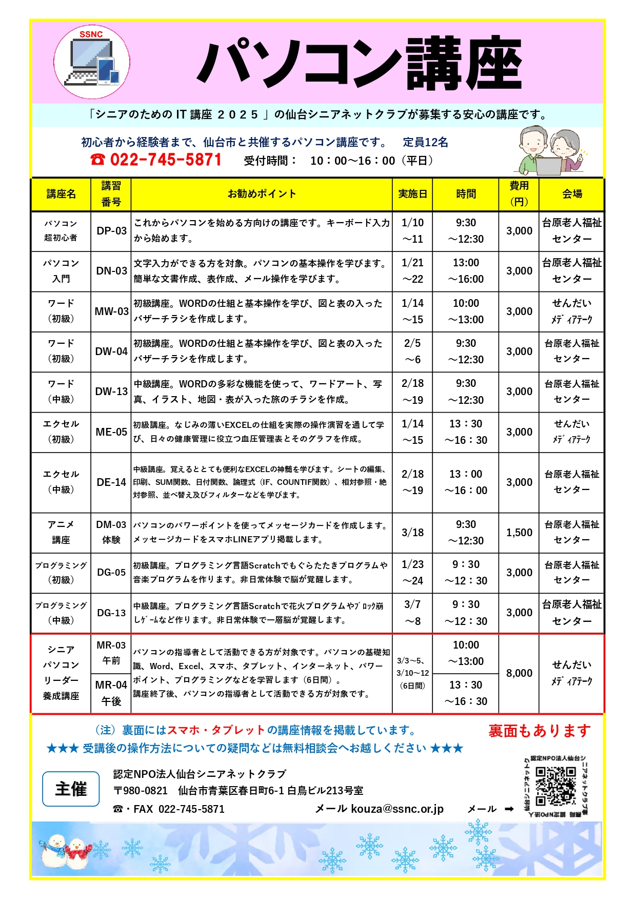 パソコン入門からWord・Excelをはじめアニメ・プログラミング・シニアパソコンリーダー養成講座と多彩な講座をご用意しております。