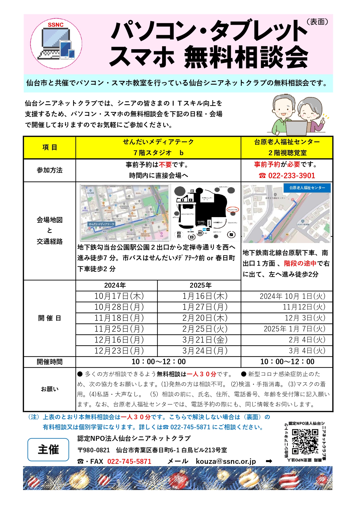 仙台市と共催でパソコン・スマホ教室を行っている仙台シニアネットクラブの無料相談会です。