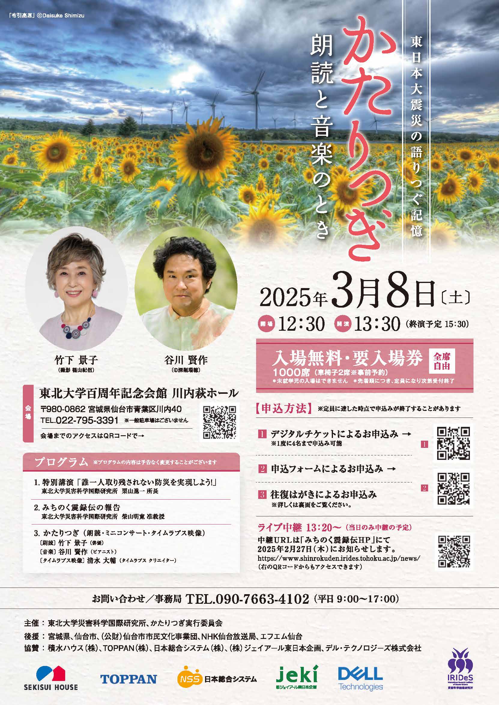 東日本大震災の記憶と記録を後世に伝え残す、東日本大震災語りべシンポジウムを今年度も開催します。あらためて思いだすこと、あらためて語り合う機会を創り、より多くの方に実際の体験が語り継がれ、心の備えを喚起すること、被災した人々の心の痛みや悲しみに寄り添うとともに、今後の防災・減災教育につなげることを目的として継続しています。