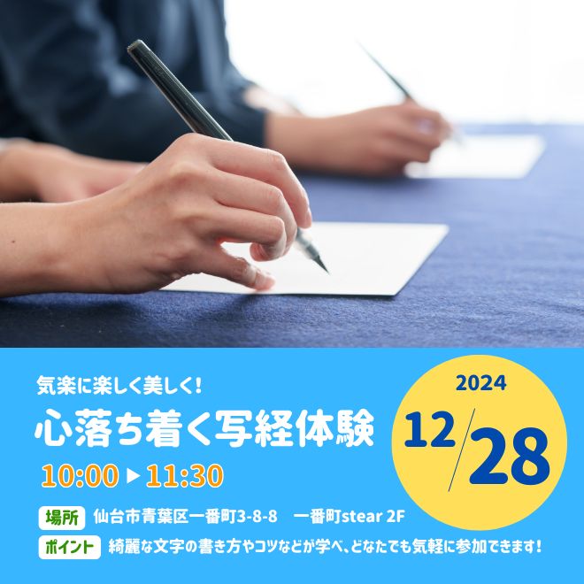 写経体験は、初めての方でも気軽に参加することができ、参加者の方々と楽しく美しい文字を学べるイベントとなっています!