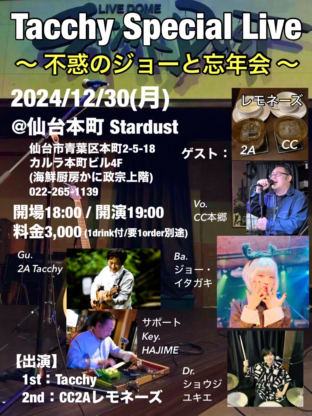 今年「不惑」を迎えたベーシスト「ジョー・イタガキ」氏のお祝いと忘年会を兼ねつつ、皆さんに楽しんで頂けるラインナップで、楽しい時間をお届けします。