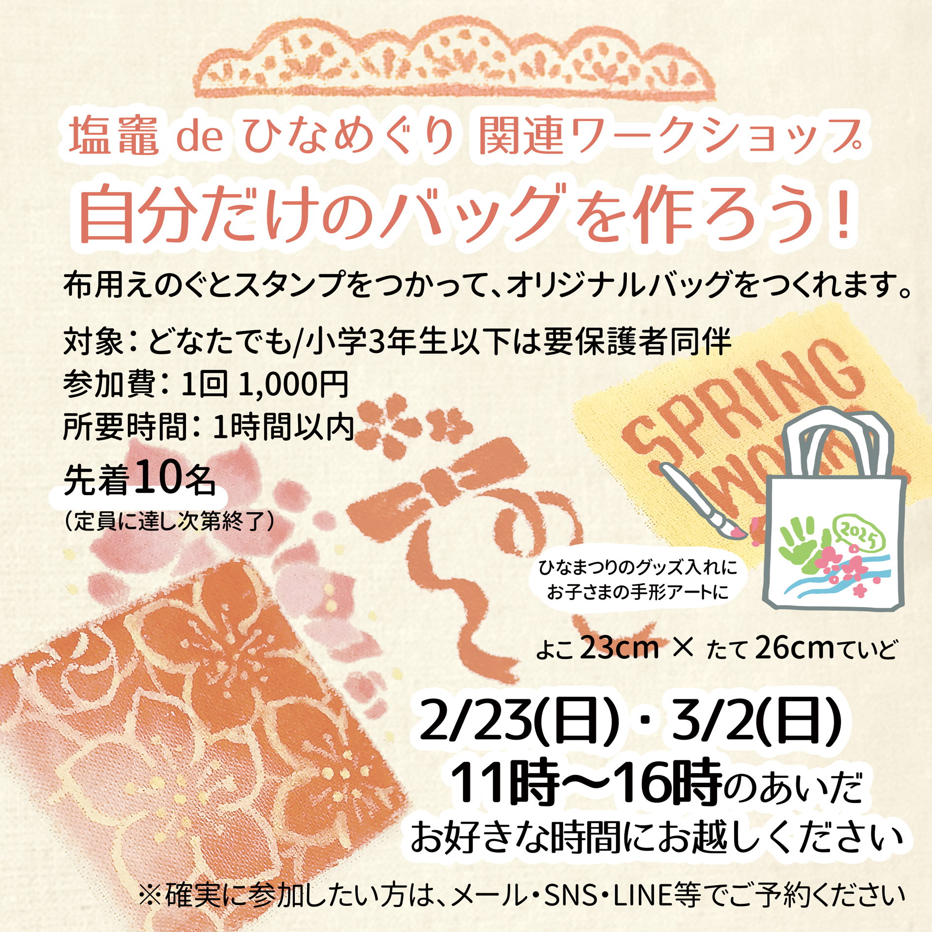 自分だけのバッグを作ろう /絵の具とスタンプで/塩竈市/予約不要/お子様から大人の方まで
