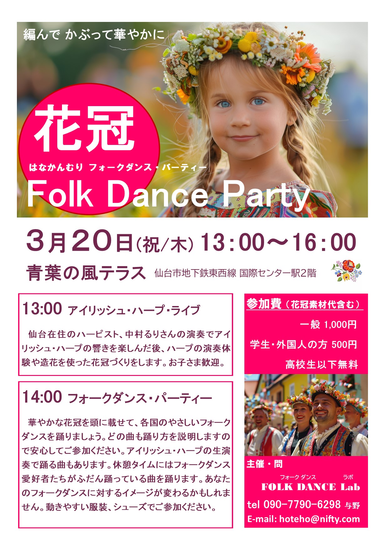 華やかな花冠を頭に載せて、各国のやさしいフォークダンスを踊りましょう。どの曲も踊り方を説明しますので安心してご参加ください。アイリッシュ・ハープの生演奏で踊る曲もあります。休憩タイムにはフォークダンス愛好者たちがふだん踊っている曲を踊ります。あなたのフォークダンスに対するイメージが変わるかもしれません。動きやすい服装、シューズでご参加ください。