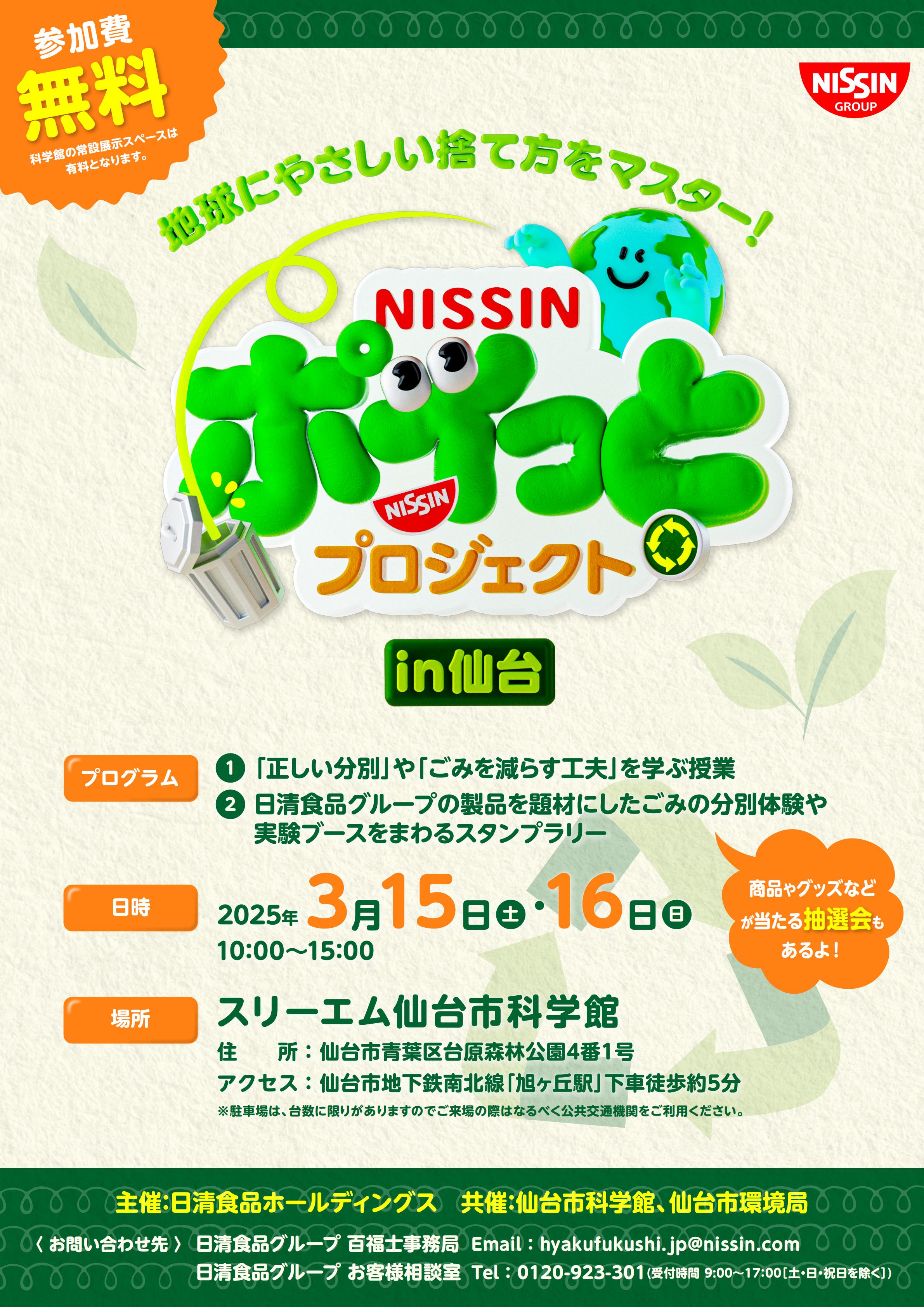 日清食品ホールディングスと仙台市が共同し、日清食品グループ 百福士プロジェクト「地球にやさしい捨て方をマスター!NISSIN ポイっと プロジェクト in 仙台」を開催します。