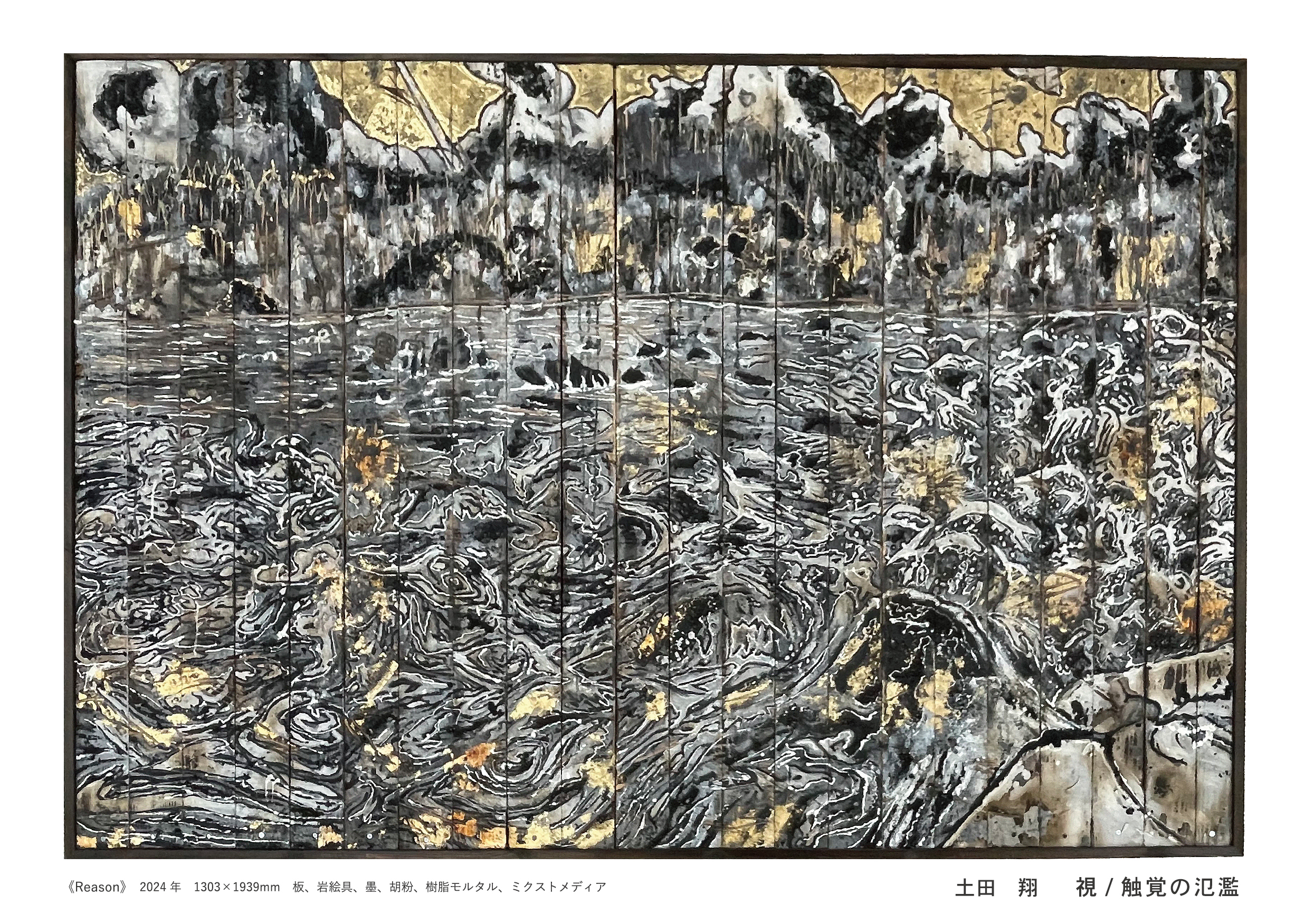 土田翔は福島県に生まれ、東北芸術工科大学で日本画を学びました。最上川や京都・大原の自然を、大胆かつ克明に墨線で埋め尽くす山形県出身の日本画家・小松均に魅せられ、「直写法」と称される小松独特の描写法を自分なりに解釈し直して実践することで、スケールが大きく、また視覚と触覚が渾然一体となった注目すべき制作を続けています。その作品は、日本画という美術における一つのジャンル、さらには絵画におけるフレームの意識も超え出ようとする契機を内包しています。