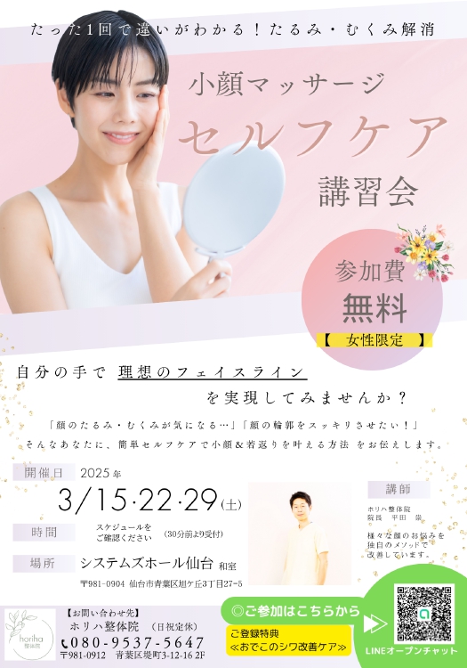 「1回で実感!むくみゼロ」をテーマに、小顔&若返りのプロが伝授するセルフケア講習です。自宅で簡単にできる「美顔デザインリンパマッサージ」を学び、すっきりフェイスラインを手に入れましょう。