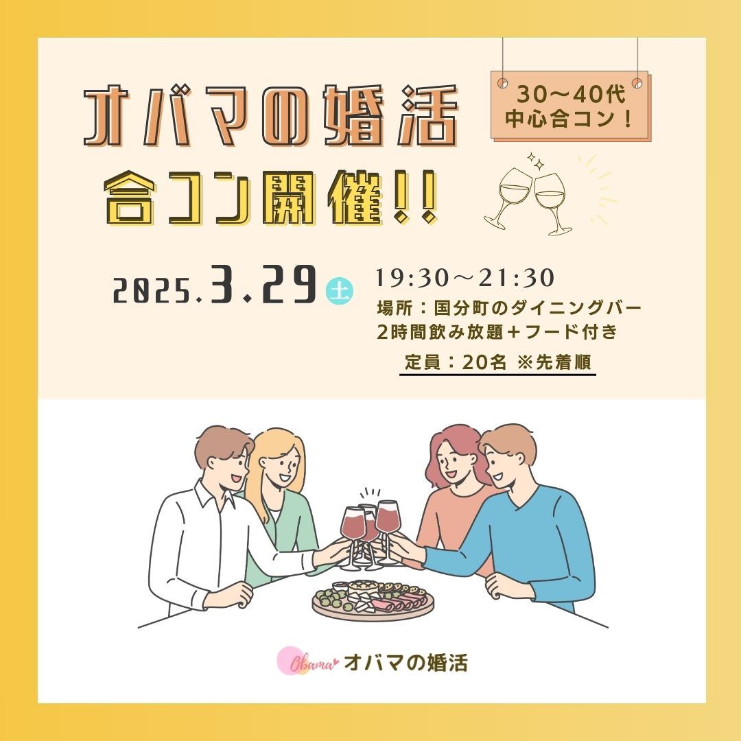 https://www.obama-konkatsu.com/event?utm_source=url&utm_medium=Pt&utm_campaign=event_250329ki2主催:オバマの婚活