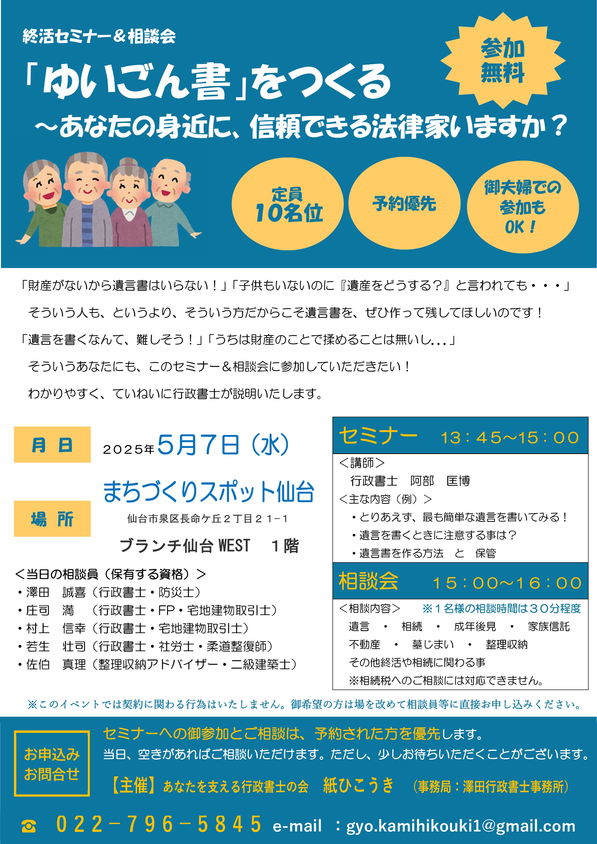 「遺言を書きたい!」とお考えの方だけでなく、高齢者のご家族や「単に遺言について関心があるだけ」の方の御参加も歓迎いたします。