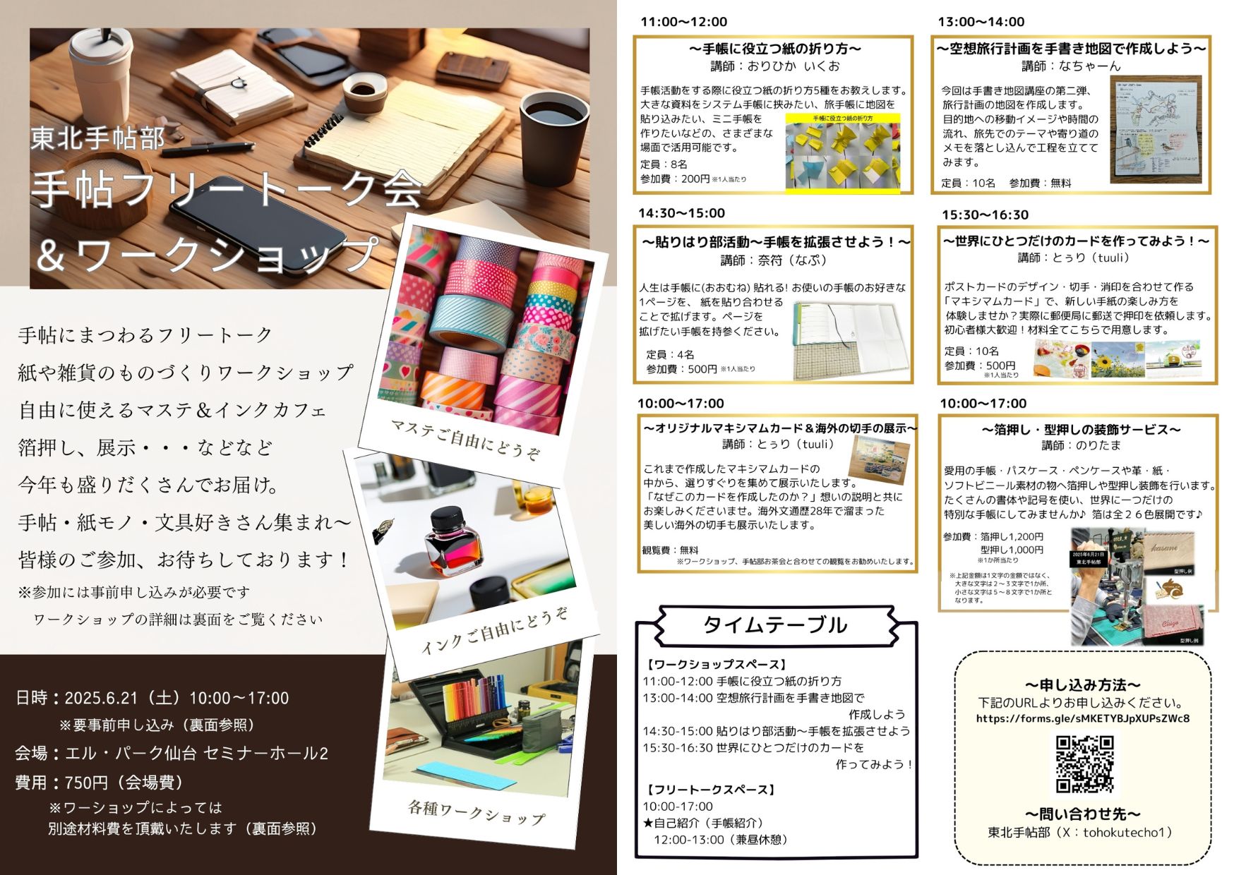 開催内容 手帖にまつわるフリートーク会、紙や雑貨のものづくりワークショップ、自由に使えるマステ&インクカフェ、箔押し、展示等を行います。