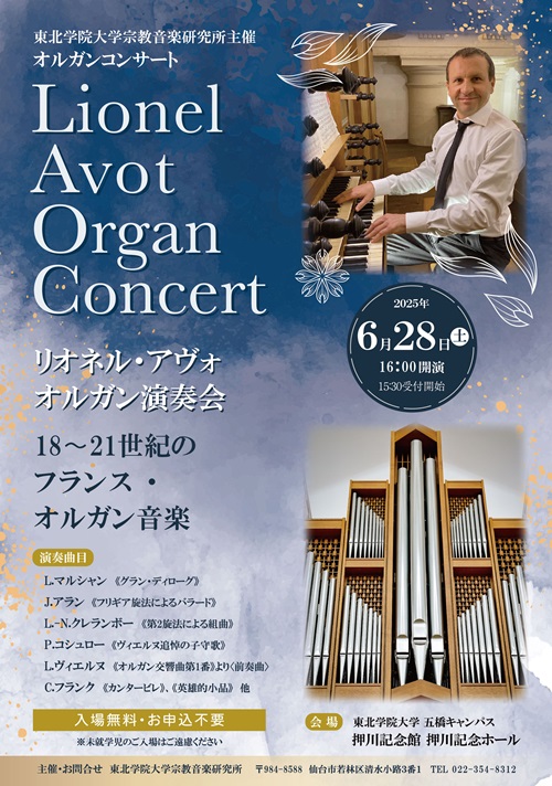 フランスよりリオネル・アヴォ氏をお招きし、18世紀から現代までのフランス・オルガン音楽の伝統をたどる演奏会です。押川記念館ホール設置のケルン・オルガンは、フランスのストラスブールで制作された楽器です。この楽器の魅力を最大限に引き出す演奏会となるでしょう。