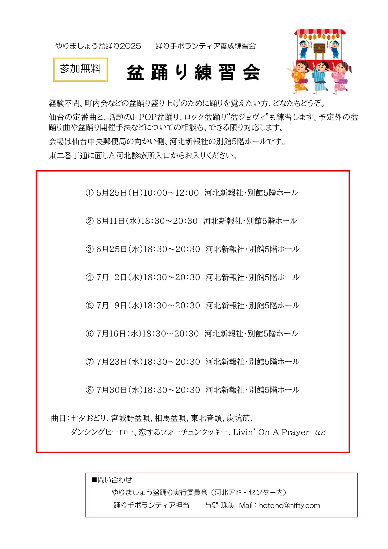 問/やりましょう盆踊り実行委員会事務局(河北アド・センター内)