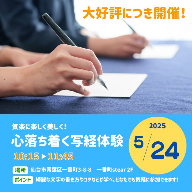 写経体験は、初めての方でも気軽に参加することができ、参加者の方々と楽しく美しい文字を学べるイベントとなっています!