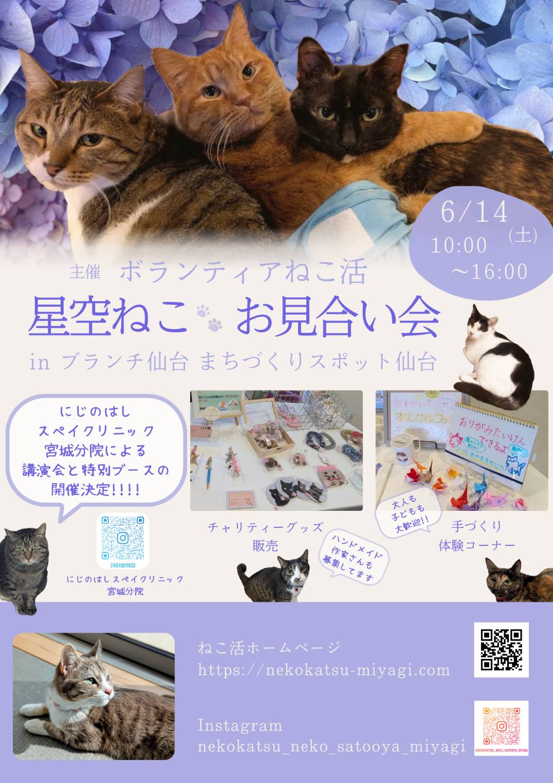 ずっとの家族になってくれる方、ボランティアとして譲渡会のお手伝いやハンドメイド作品をご提供頂ける方、猫の預かりをして頂ける方を募集しています。