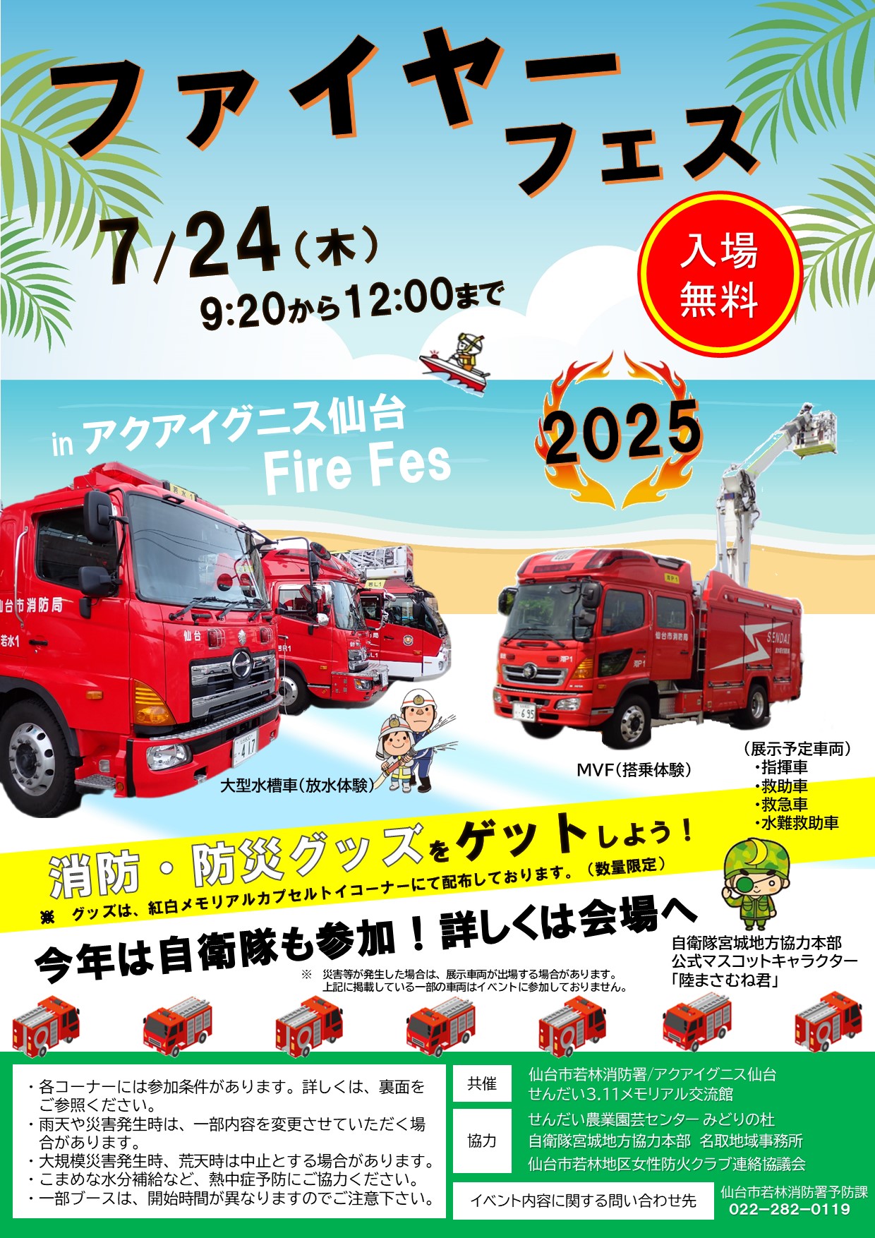仙台市若林区の防災イベントをアクアイグニスで開催。赤い消防車がズラリ大集合!MVF搭乗体験、消防ホースの筒先を持って放水体験、綱渡り体験、ちびっこ消防士撮影、消防音楽隊コンサートなどお楽しみ体験が盛りだくさん。体験は申込不要。