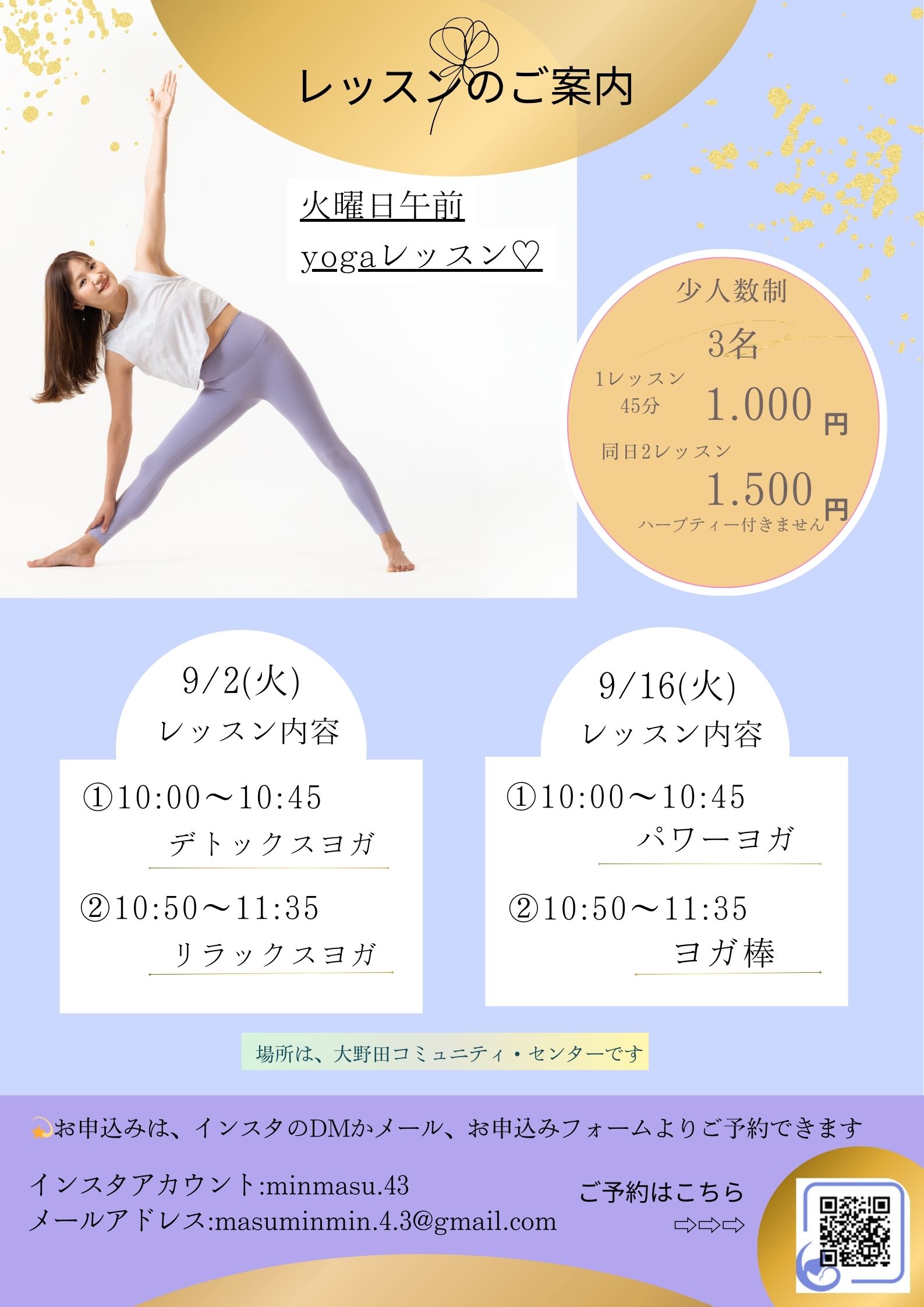 9月の火曜日ヨガレッスンのご案内をさせていただきます。