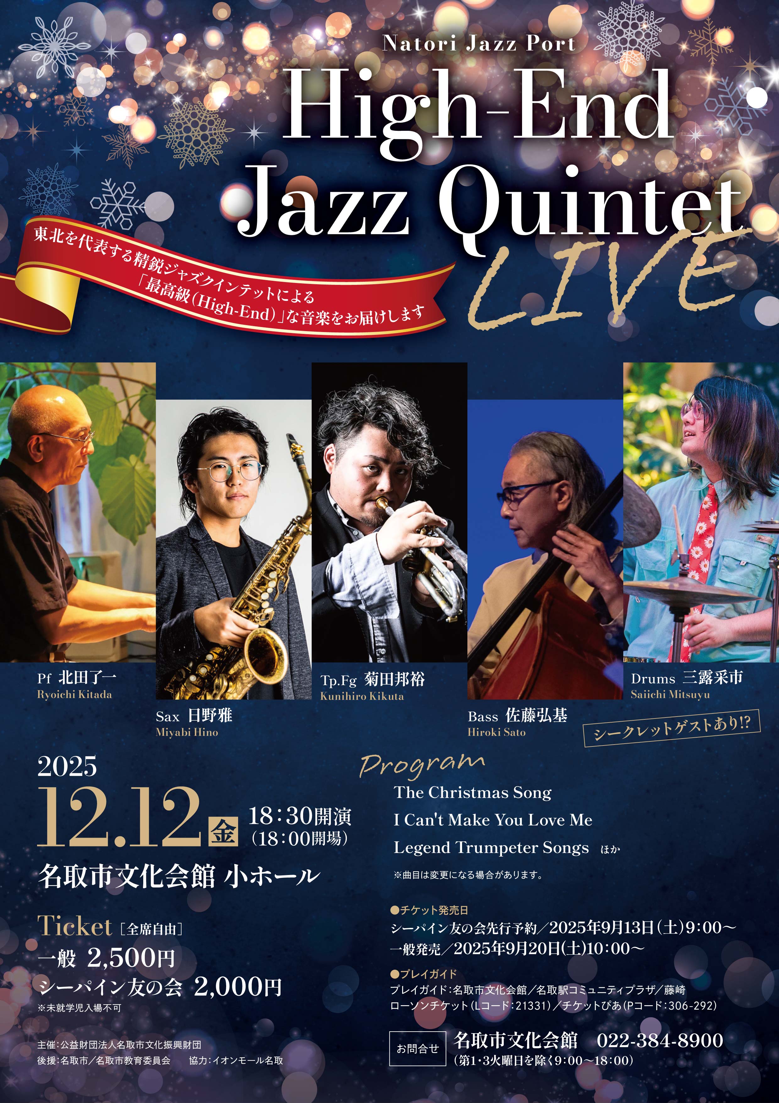仙台在住の若手トランぺッター菊田邦裕率いる精鋭ジャズクインテッドによる「最高級(High-End)」な音楽をお届けします。金曜の夜にステキなひとときを過ごしませんか。