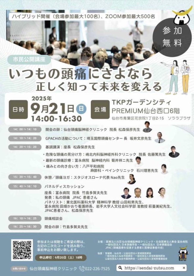 今回の市民公開講座では、専門の先生方が頭痛の見分け方や最新の治療法を、わかりやすくご紹介します。さらに、日常生活に役立つ工夫や、気軽にできる「頭痛ヨガ」の体験も予定しています。