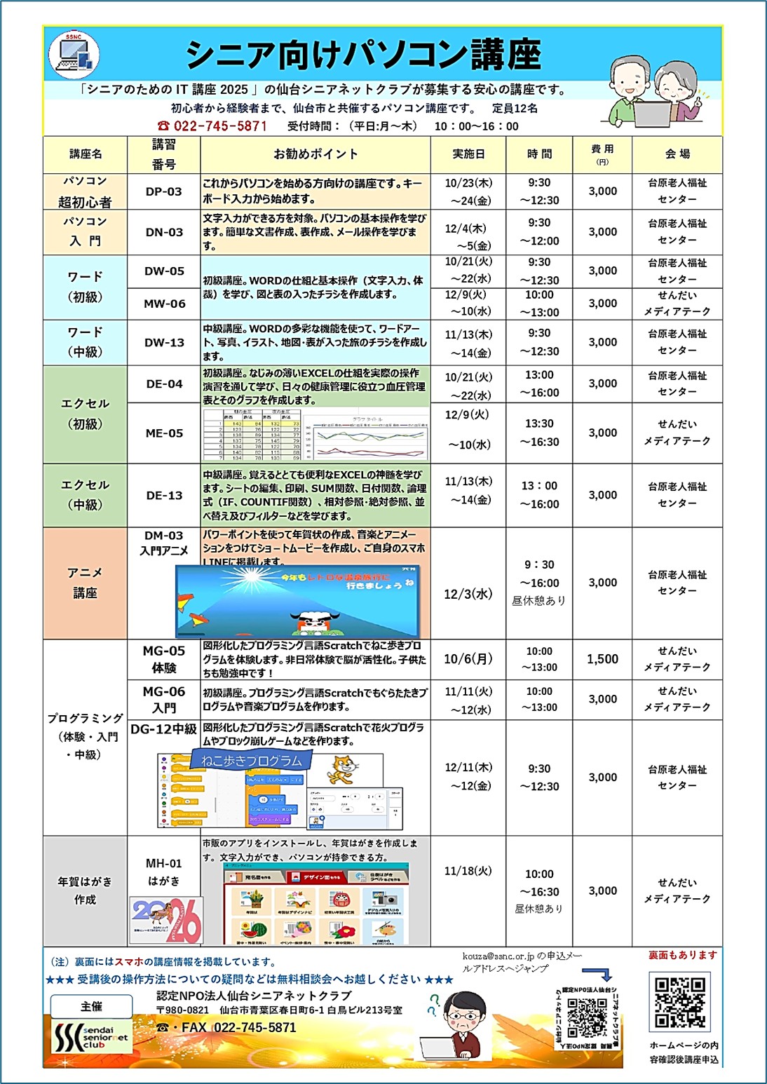 「シニアのための IT 講座2025」の仙台シニアネットクラブが募集する安心の講座です。