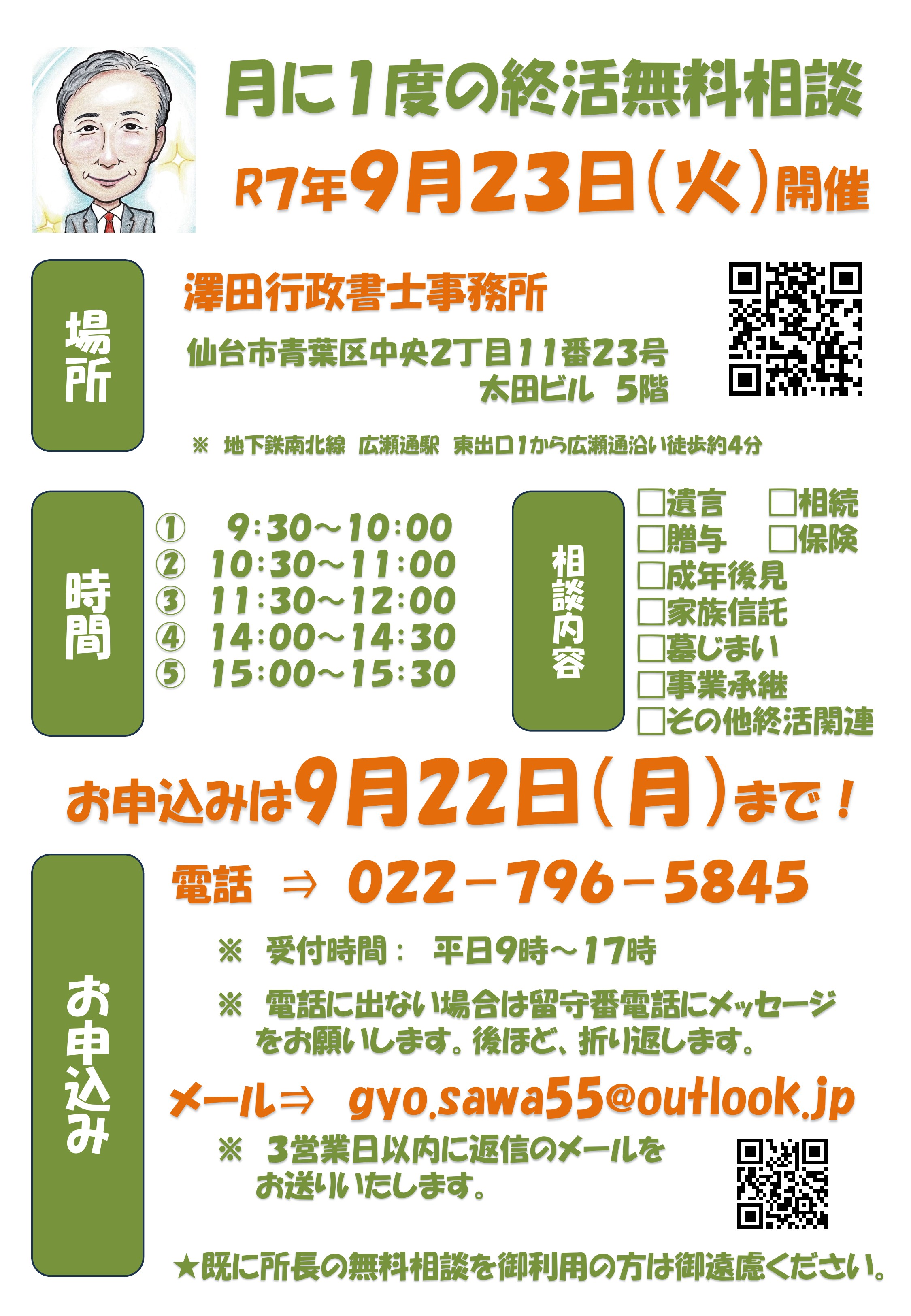 令和7年9月の遺言や相続、その他の終活関連の無料相談の日をお知らせいたします。