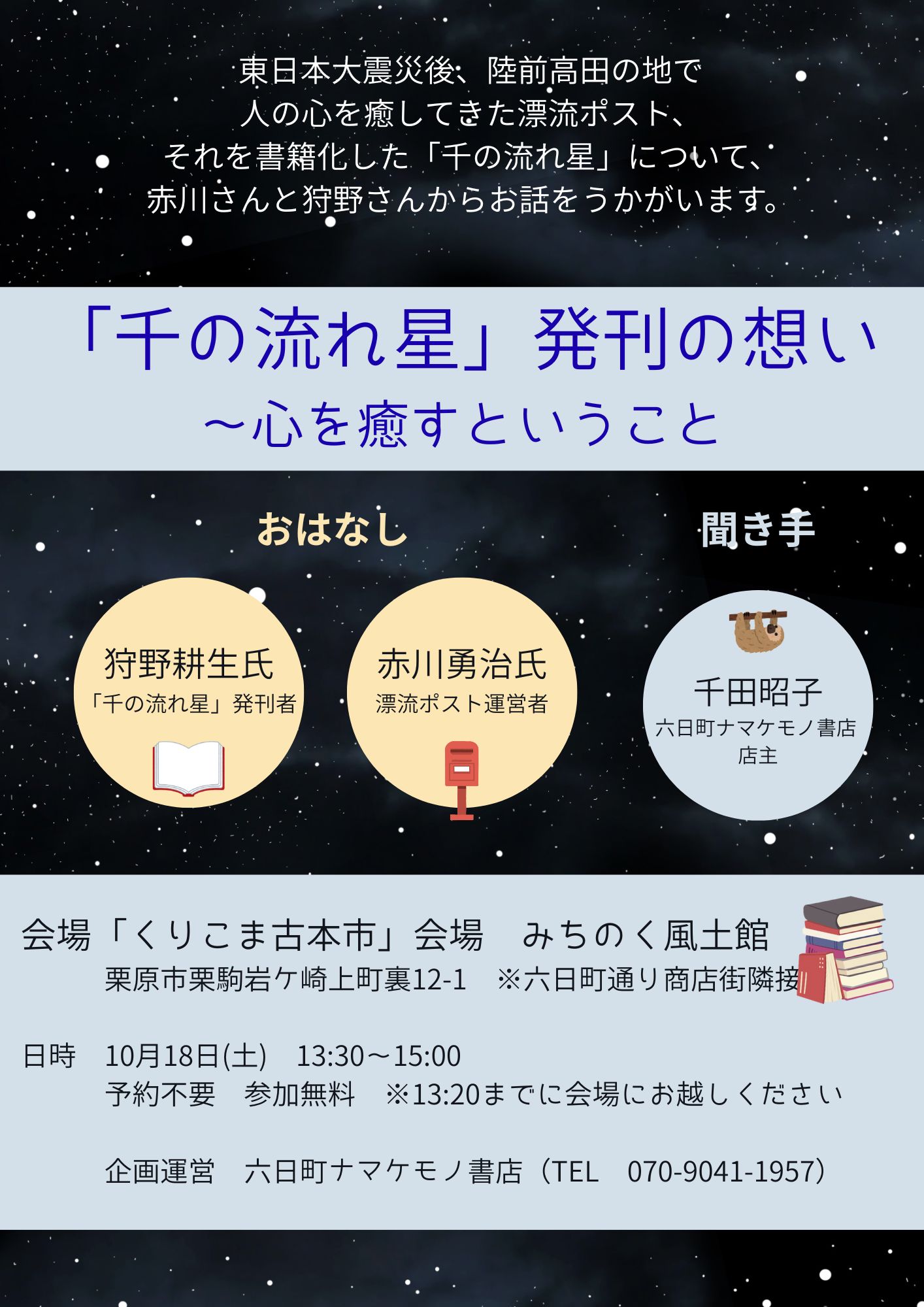 書籍「千の流れ星」発刊の経緯をお二人から伺います。当時の関係者の状況、心情に想いをはせ、東北の未来をちょっと考えます。