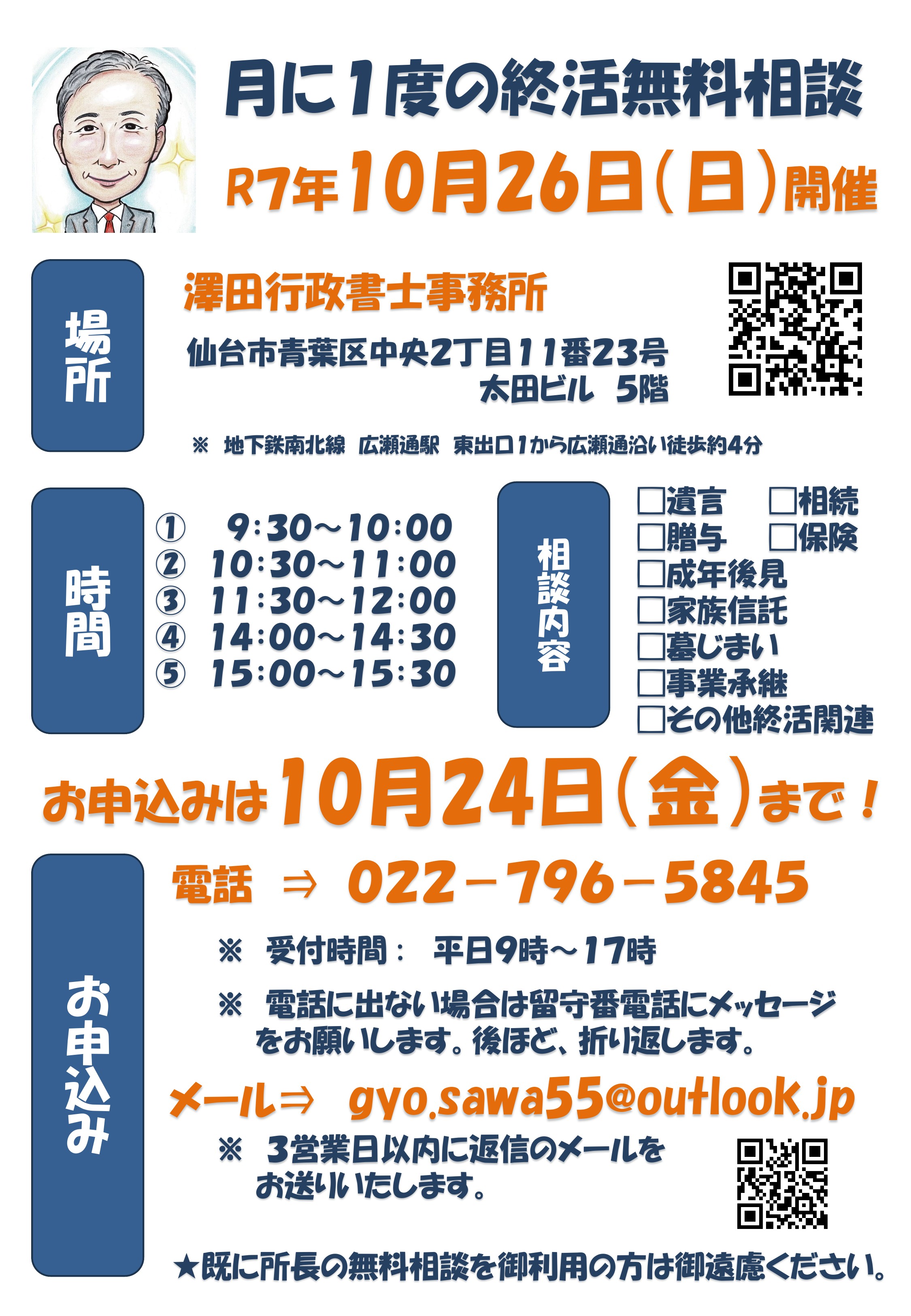 ただし、この日に都合が悪い場合には、他の日時で無料相談を承ります。