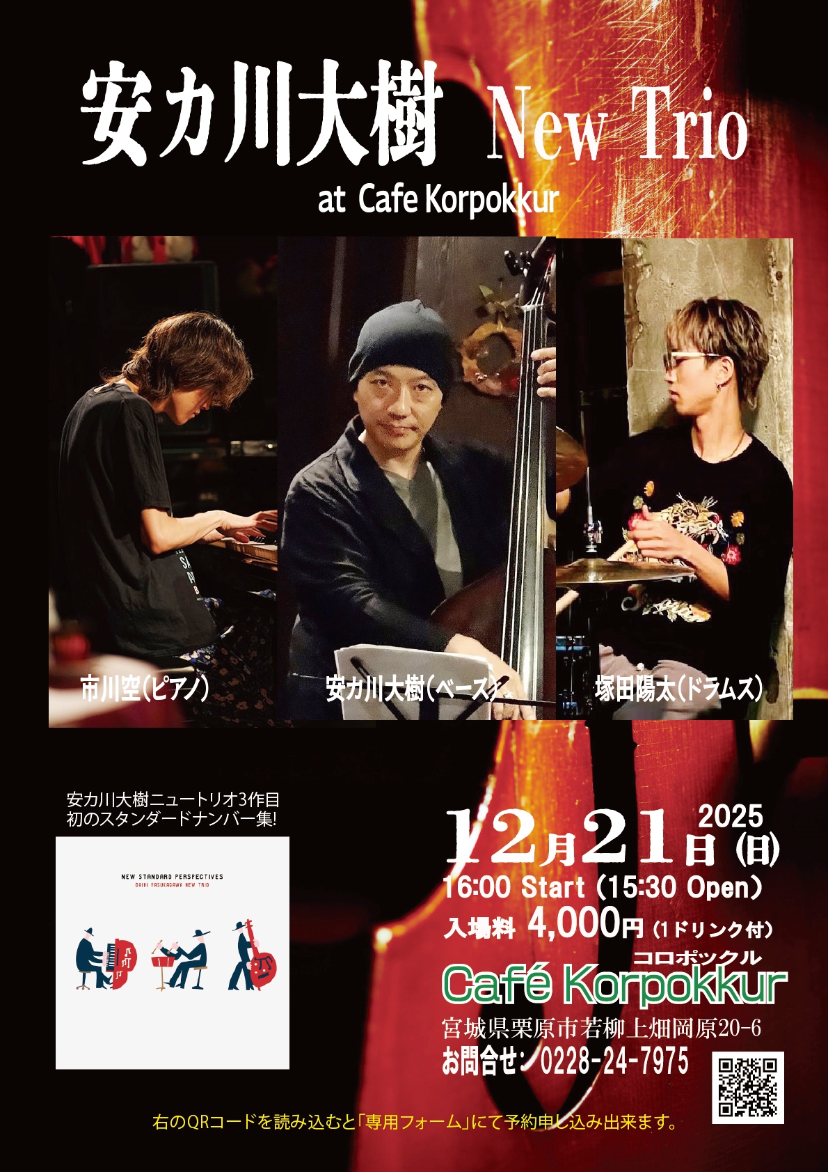 多くの有名ミュージシャンと共演を重ね、今やベテランの域に達した人気ベーシスト安カ川大樹。彼の一昨年前に結成したニュートリオでのライブです。今回は新しいアルバム「New Standard Perspectives」の発売記念ツアーの一環で伊豆沼「カフェ・コロポックル」でのライブとなります。
