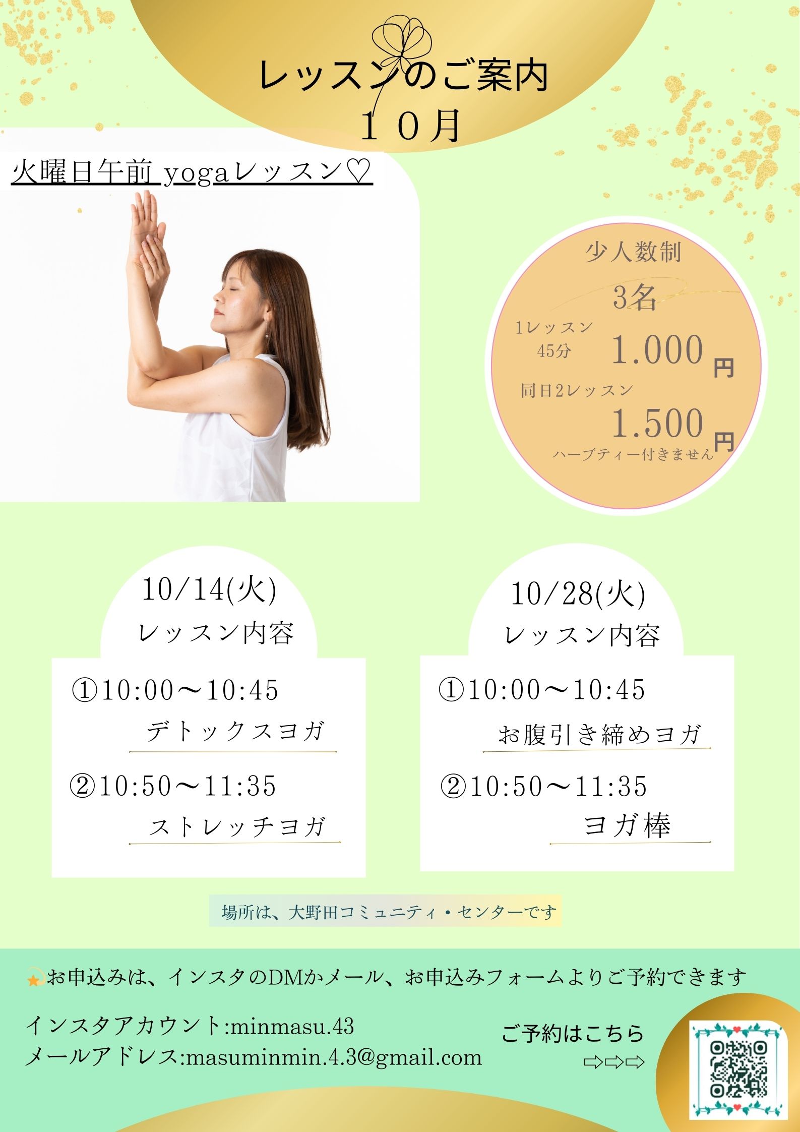 インスタグラムのメッセージ、Eメール、QRコードの申込みフォームからご予約ください。