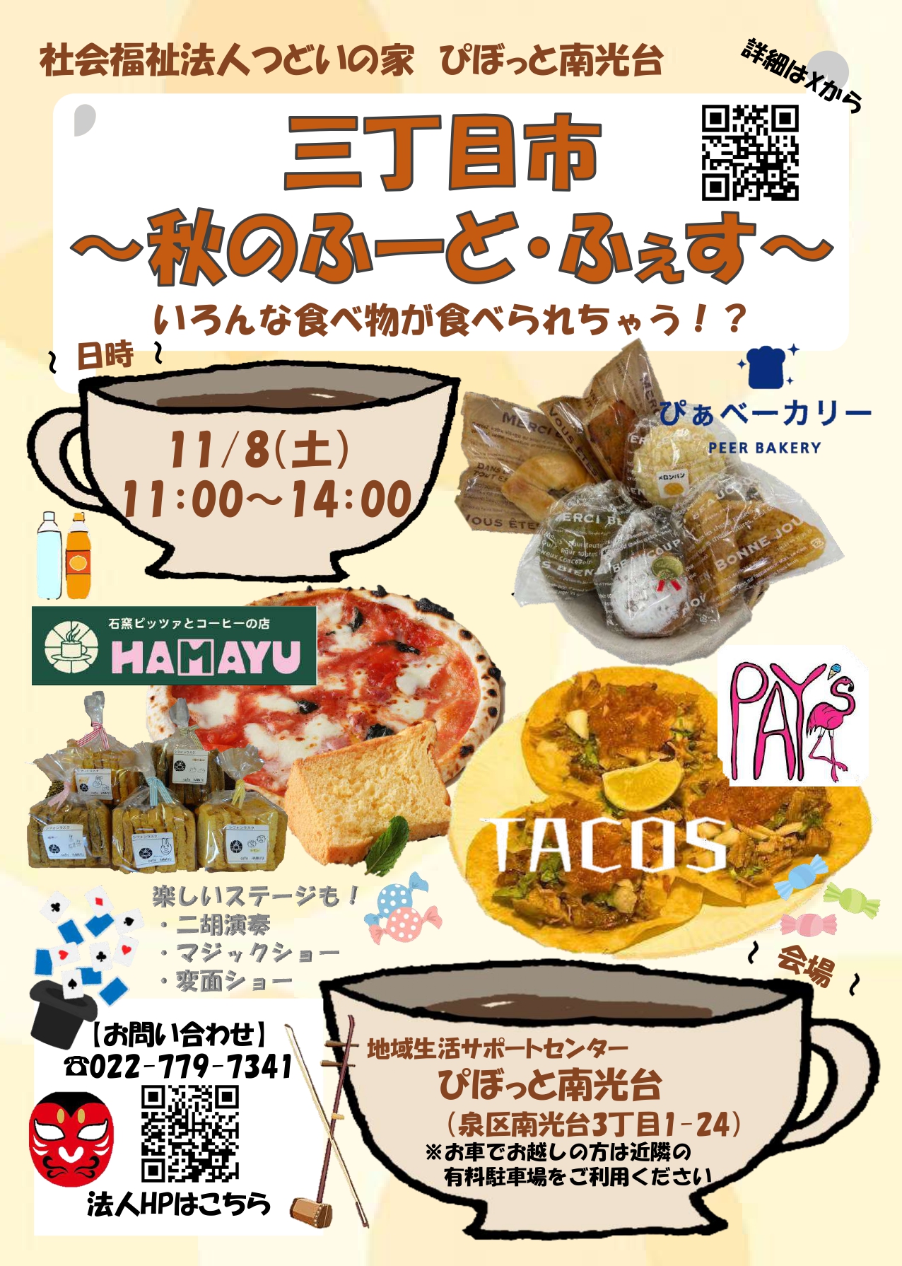 昨年度ご好評をいただいた「三丁目市〜秋のぱん・ふぇす〜」に続き、今年度も地域の方々との交流イベントを開催いたします。パンや焼き菓子、タコスなどの食品販売や、マジックショー、変面ショー、二胡演奏などのプログラム、駄菓子すくい等、楽しい催しものをご用意いたしております。お子さまのご来場も大歓迎です! 購入したものを食べながら談笑したり、パフォーマンスを鑑賞しながら、食欲の秋、芸術の秋を楽しみましょう(*^-^*)みなさまのご来場をお待ちしております!