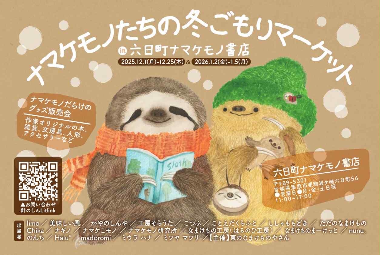 昨年大好評だった「ナマケモノたちの冬ごもりマーケット」が今年も六日町ナマケモノ書店にやってきます!全国のナマケモノ作家さんたちの魅力的なナマケモノ商品がずらりと並ぶ、東北ではめずらしいナマケモノだらけのマーケットです。一年間なまけなかった自分へのご褒美に、大切なあの人へのプレゼントに、お気に入りのナマケモノを見つけてください。