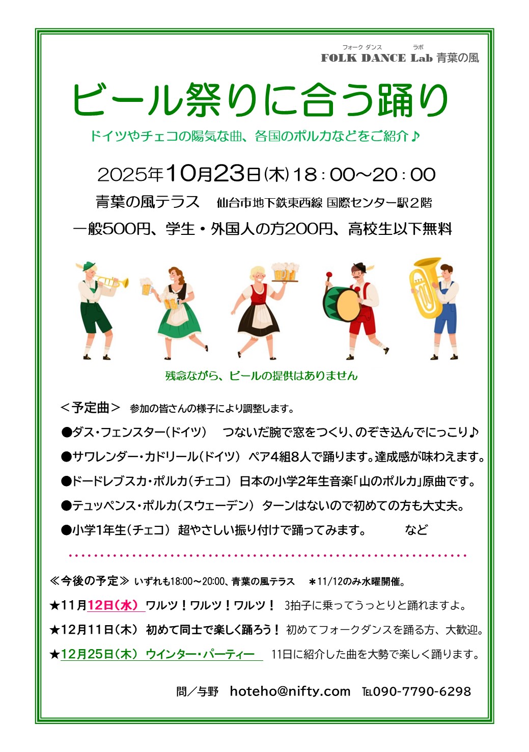 各国のやさしいフォークダンスをご紹介するワークショップです。今回はドイツ発祥の世界的イベント、オクトーバーフェストにちなんで、ビール祭りに似合いそうな踊りをピックアップしました。著名ビール産地のドイツやチェコの軽快な踊り、気持ちが弾むポルカの踊りを楽しみましょう。