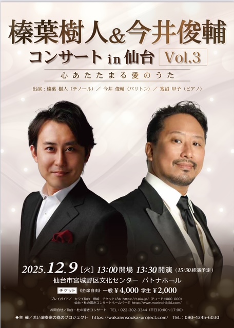 BS日本(BS日テレ)「こころの歌」に出演中の人気声楽家榛葉樹人(テノール)と今井俊輔(バリトン)、そして仙台出身のピアニスト笈沼甲子による【榛葉樹人&今井俊輔 コンサート in 仙台 Vol.3〜心あたたまる愛のうた】が開催されます。