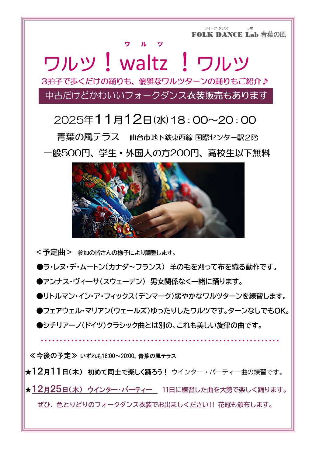 各国のやさしいフォークダンスをご紹介するワークショップです。今回は各国のワルツを踊ります。くるくる回るワルツターンの踊りだけでなく、ワルツのリズムで歩くだけの踊りもあります。ワルツなんてそんなそんな、という初めての方、大歓迎です。どうぞのぞいてみてください。