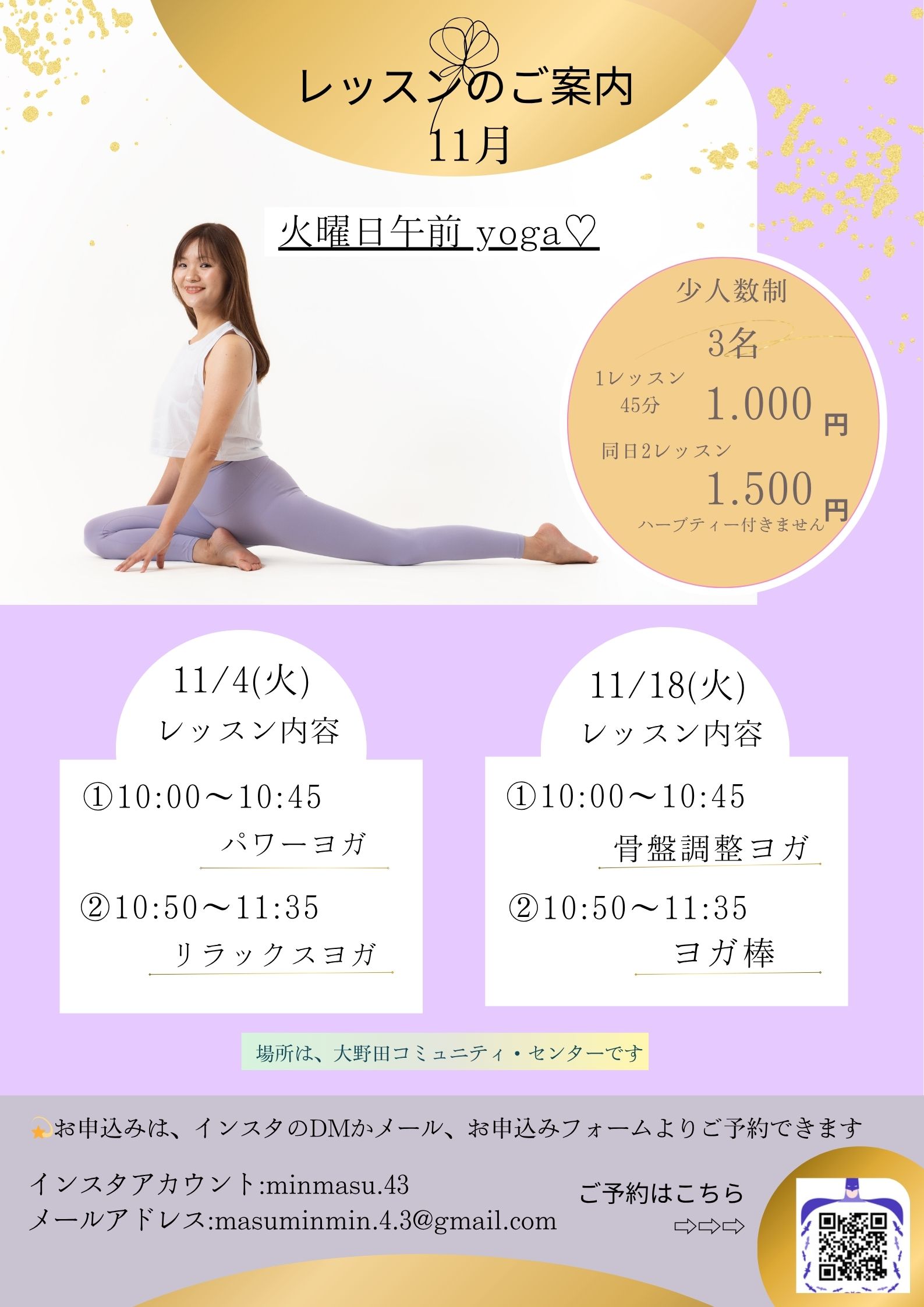 インスタグラムのメッセージ、Eメール、QRコードの申込みフォームからご予約ください。