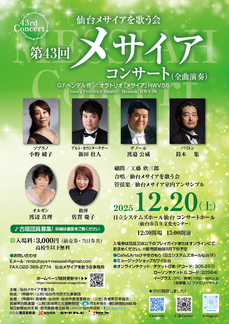 仙台メサイアを歌う会は、1983年(昭和58年)の第1回コンサートの開催以来、熱烈な「メサイア愛好者」に支えられ歌い継ぎ、今年で第43回を迎える事となりました。