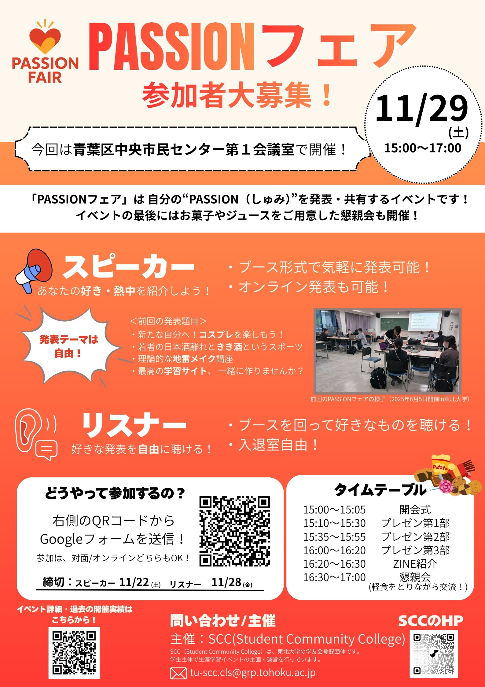 PASSION(しゅみ)フェアとは、自分の興味関心をテーマにした短いプレゼンを通じて仲間を見つけ、親睦を深めるイベント。生涯学習をテーマに活動する東北大学の学生団体「東北大学SCC」が主催しています。