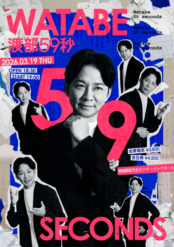 芸能界で多くを経験してきたアンジャッシュ渡部が、 再び“言葉”の現場へ帰ってくる。アンジャッシュ渡部のトークライブ『渡部59秒』初の地方公演が仙台で開催!今回も渡部の軽妙なトークと独自の視点が炸裂する “濃密59秒ワールド”をたっぷりお届け。いまの渡部が、どんな声で、どんな温度で語るのか。息つく暇もない話術と、予測不能な展開にぜひご期待ください。