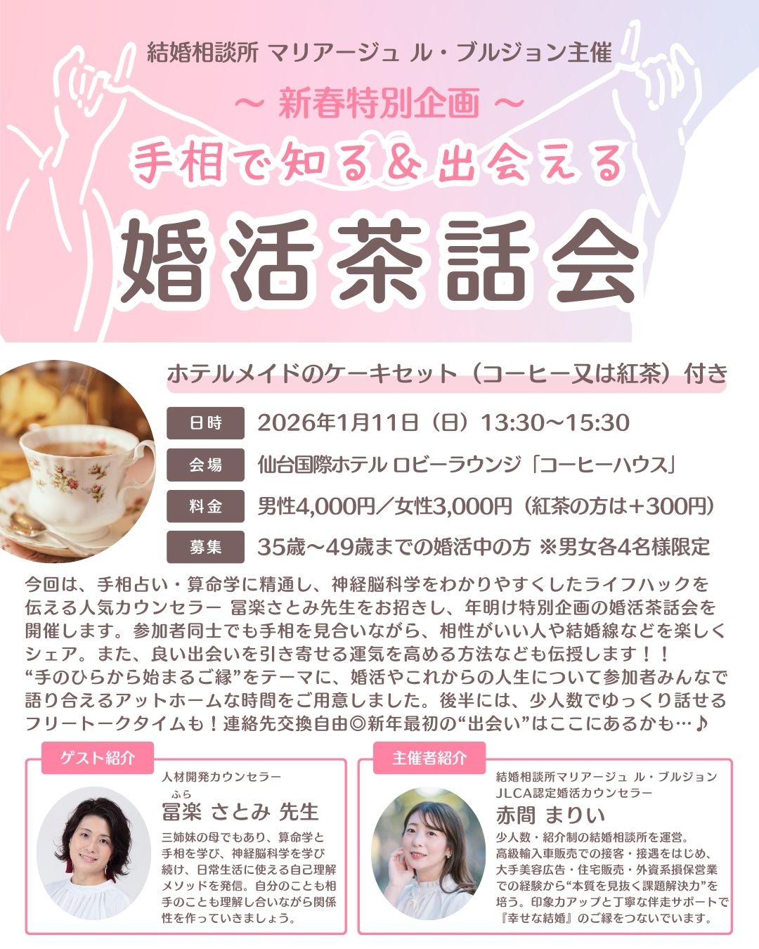 さとみ先生による手相の解説を楽しみつつ、参加者同士でも手相を見合って盛り上がれるアットホームな婚活イベントを企画しました???