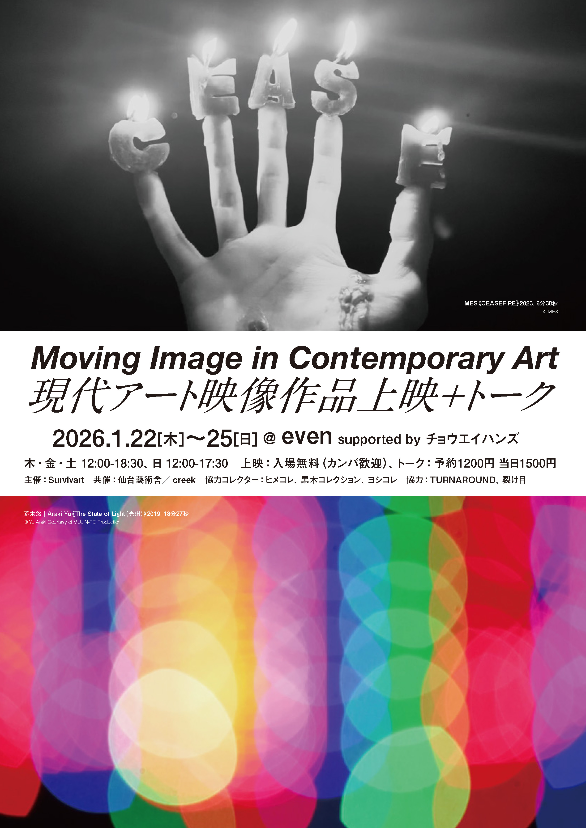 上映作家:アピチャッポン・ウイーラセタクン、荒木 悠、大木裕之、志賀理江子、趙 里奈 、松本望睦、田口行弘、松田 修、MES、百瀬 文、門眞 妙、佐々木友輔