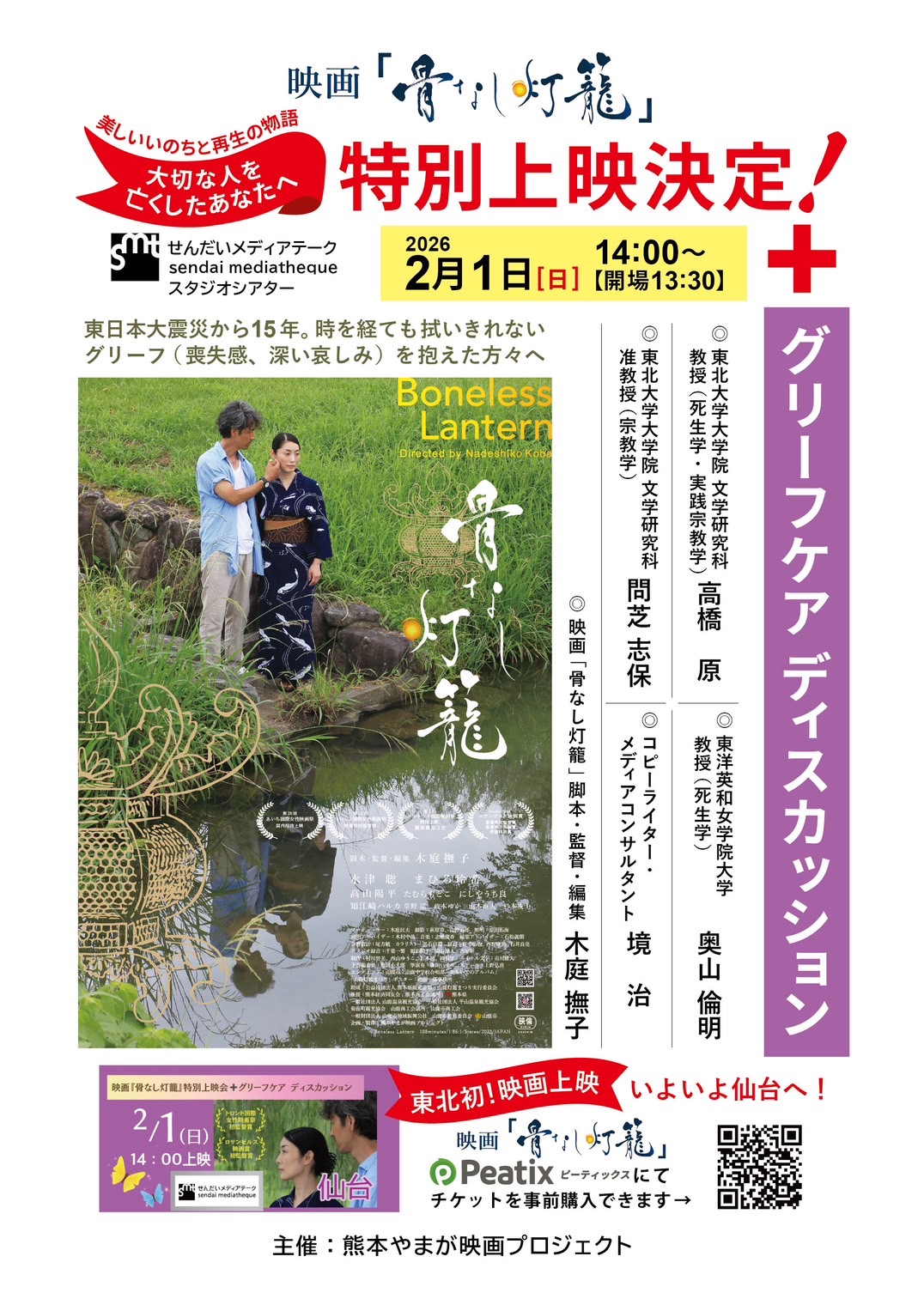 司会をメディアコンサルタントの境治さんにお願いして、東京に引き続き東洋英和女学院の奥山倫明先生と、今回は東北大学の先生たちをお招きして、映画『骨なし灯籠』とグリーフケア (大切な人を亡くした哀しみに寄り添う、心のケア)についてお話します。