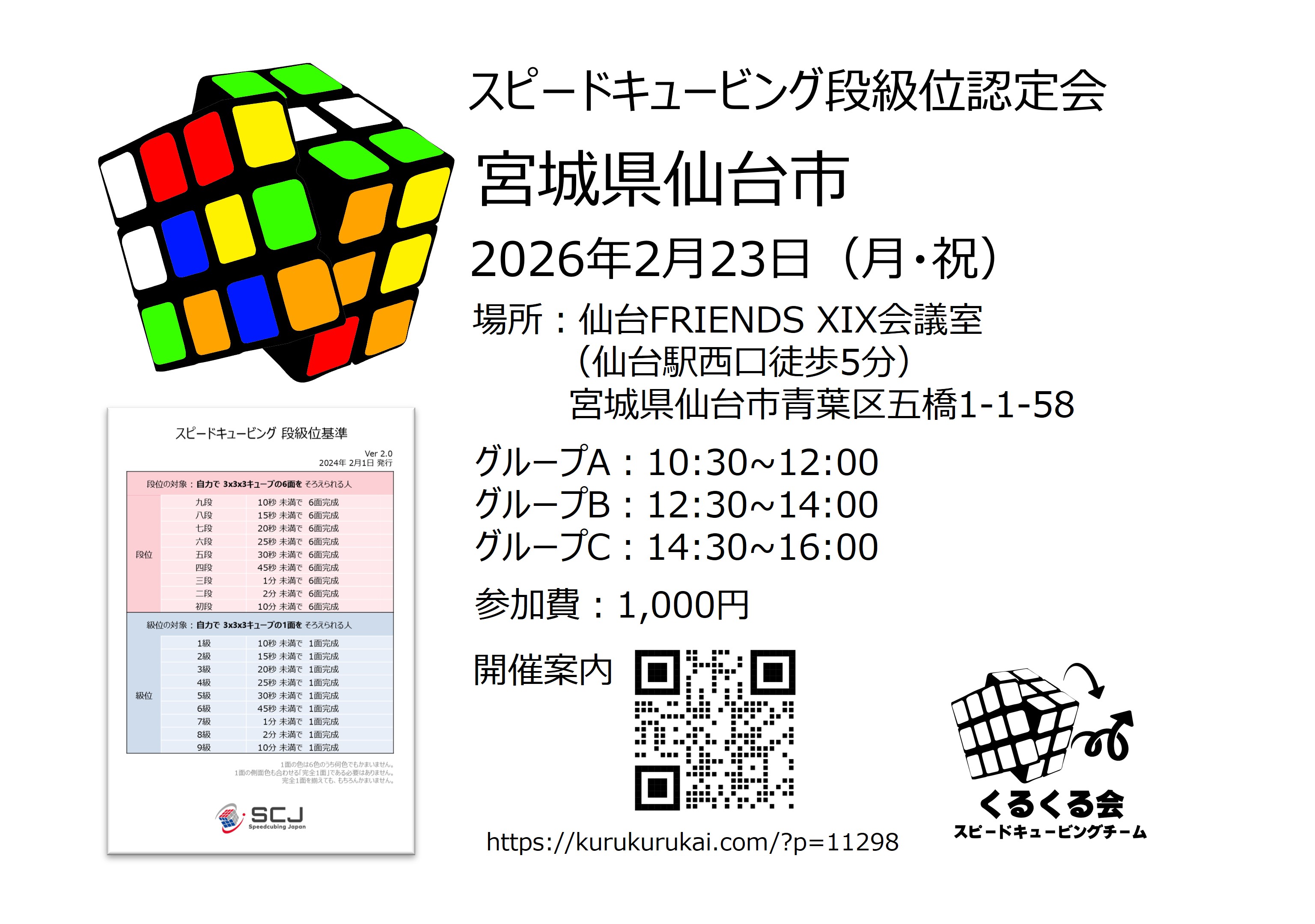 ・一般社団法人スピードキュービングジャパン(SCJ)が公認するスピードキュービング段級位認定員が認定します。